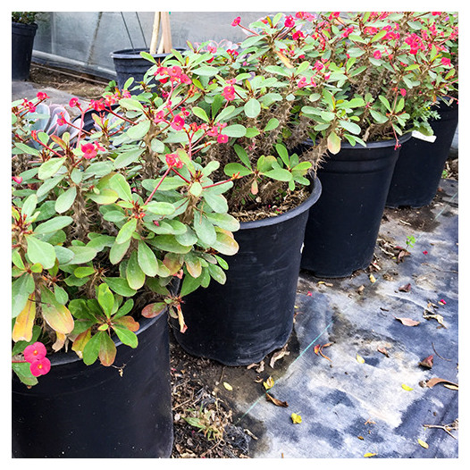 An incredibly unique drought-tolerant srhub, the Euphorbia milii is commonly referred to as the Crown of Thorns. It has sharp pointed tips densly covering it's woody bracts. It's noted that Jesus Christ wore this plant on his head at the time of his crucifixion, hence the name Crown of Thorns. It has an impressive bloom from Spring lasting until Fall in many climates. It also performs well in poor soils. Many also grow Euphorbia milii as an indoor plant. Maintenance is relatively low and it's tolerant of deer and rabbits. USDA Zones 9-11.